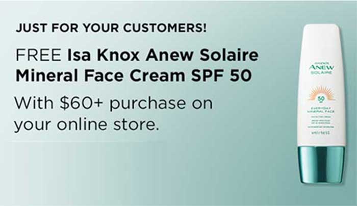 In Campaign 22 customers who place a $60 order at your online store will receive a free Isa Knox Anew SPF 50 Mineral Sunscreen! A $22 value!